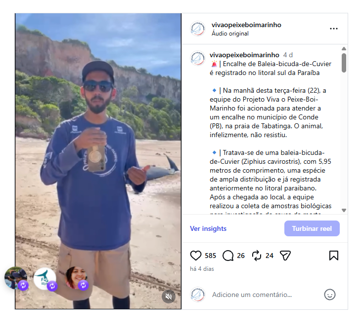 Logo cedo da manhã desta última terça-feira (22), a equipe do Projeto Viva o Peixe-Boi-Marinho (PVPBM) recebeu uma notificação de encalhe de um mamífero aquático de grande porte no litoral sul da Paraíba, no município de Conde, na altura de Tabatinga. O animal havia sido avistado inicialmente com vida, mas logo em seguida chegou a óbito. A equipe do PVPBM, realizado pela Fundação Mamíferos Aquáticos com patrocínio da Petrobras e do Governo Federal, por meio do Programa Petrobras Socioambiental, já estava em deslocamento ao local.