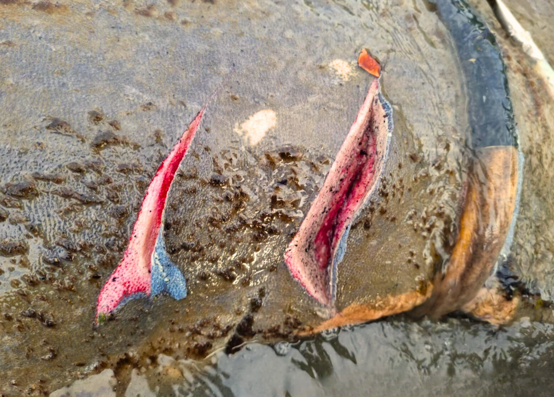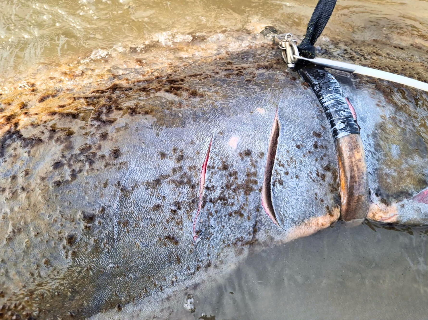 Colaboradores da região encontraram na manhã de domingo o transmissor de monitoramento de Astro com o cinto cortado, indicando uma colisão. A equipe do PVPBM localizou o animal com múltiplos cortes profundos nas regiões lateral e dorsal, todos provocados por hélice de embarcação. Alguns ferimentos ultrapassam 4 cm de profundidade.