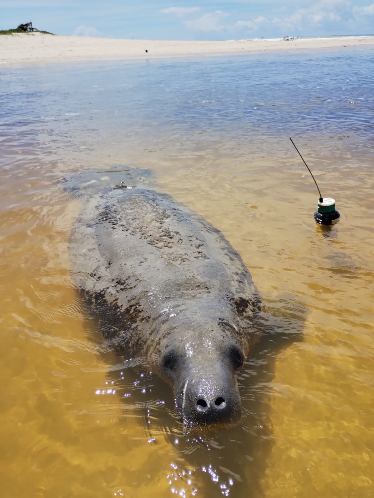 O animal está saudável, apresentando comportamento natural. O Projeto Viva o Peixe-Boi-marinho reforça que não se deve interagir com os peixes-bois-marinhos.